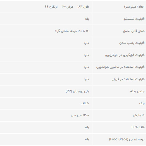ظرف مایکروویو 1200 سی سی از مواد اولیه مرغوب پلی پروپیلن (PP) تولید شده است. رنگ این محصول شفاف می باشد، طول آن 183 میلیمتر، عرض 120 میلیمتر و ارتفاع آن 69 میلیمتر میباشد. از قابلیتهای این ظرف میتوان به دارا بودن نشان سیب سلامت، پلمپ شدن، امکان قرارگیری در مایکروویو، ماشین ظرفشویی و فریزر اشاره کرد. یکی از نکات کلیدی که این ظرف را مناسب بستهبندی مواد غذایی سرد و گرم میکند، عدم وجود ماده مضر BPA است. ظرف 1200 برای رستورانها بعنوان ظروف تک پرسی و برای محصولاتی مانند بستنی با وزن یک کیلوگرم استفاده میشود. ظرفیت حجمی این ظرف 1200 سی سی بوده، دارای ضخامت مناسب و استحکام کافی است.